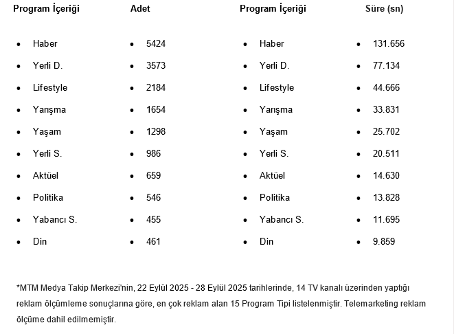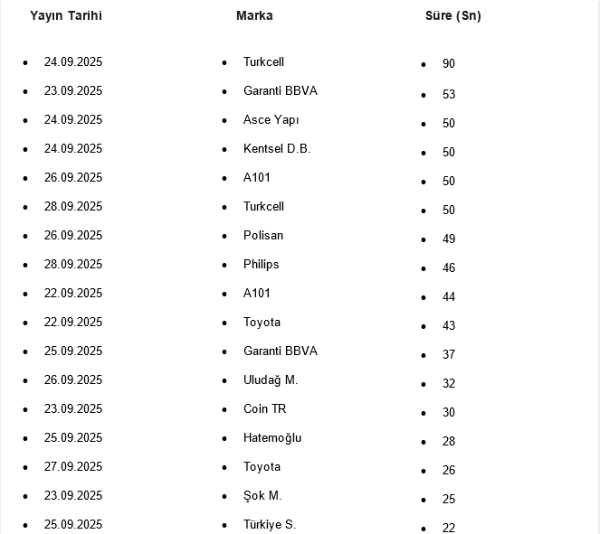 22 EYLÜL - 28 EYLÜL 2025 HAFTASINDA TV'DE YAYINLANAN YENİ REKLAMLAR