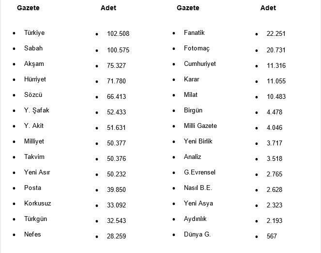 01 EYLÜL - 07 EYLÜL 2025 Gazetelerin Tirajları