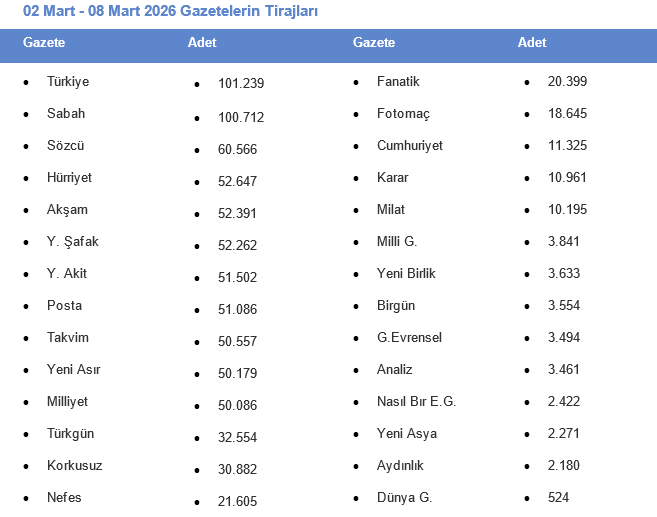 📰 GAZETELERİN HAFTALIK TİRAJLARI