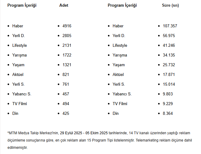 EN ÇOK REKLAM ALAN 10 PROGRAM TİPİ