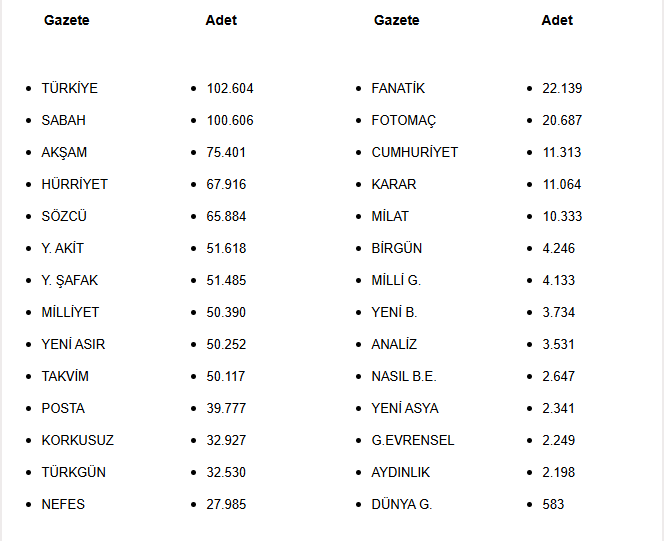 08 EYLÜL - 14 EYLÜL 2025 Gazetelerin Tirajları