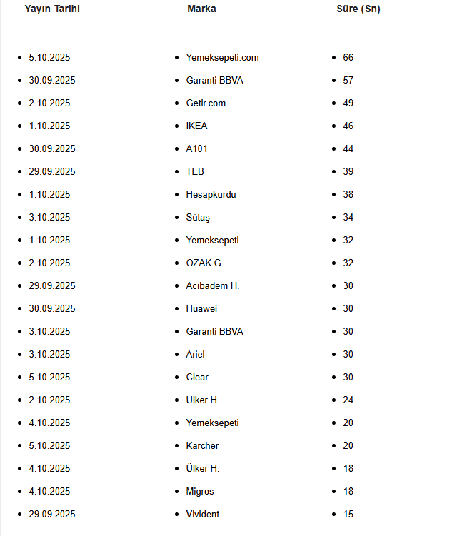 29 EYLÜL - 05 EKİM 2025 HAFTASINDA TV'DE YAYINLANAN YENİ REKLAMLAR