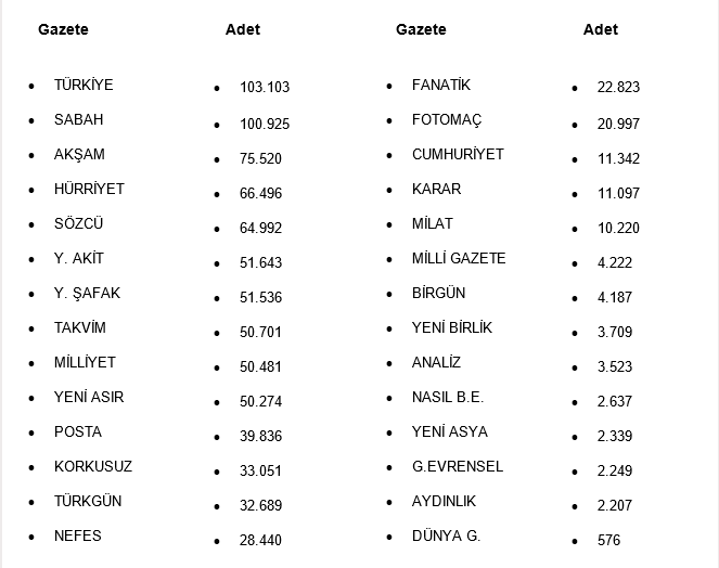 22 EYLÜL - 28 EYLÜL 2025 Gazetelerin Tirajları