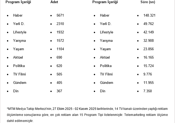 EN ÇOK REKLAM ALAN 10 PROGRAM TİPİ