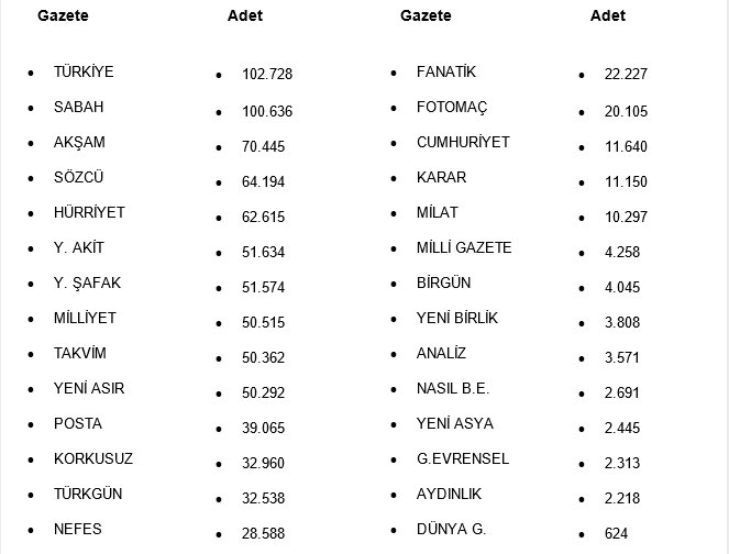 06 EKİM - 12 EKİM 2025 Gazetelerin Tirajları