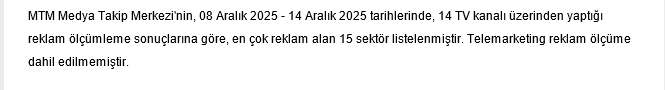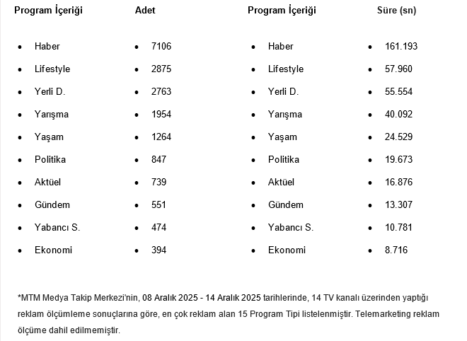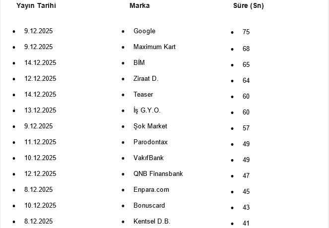 08 ARALIK - 14 ARALIK 2025 HAFTASINDA TV'DE YAYINLANAN YENİ REKLAMLAR
