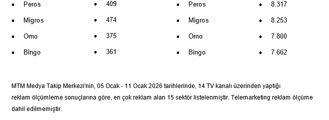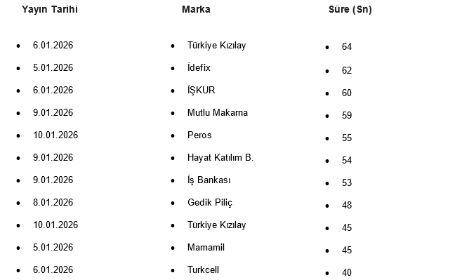 05 OCAK - 11 OCAK 2026 HAFTASINDA TV'DE YAYINLANAN YENİ REKLAMLAR