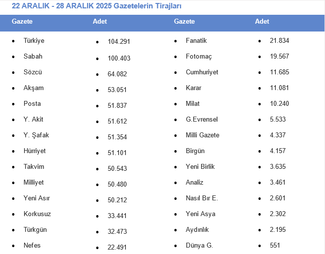 📰 GAZETELERİN HAFTALIK TİRAJLARI