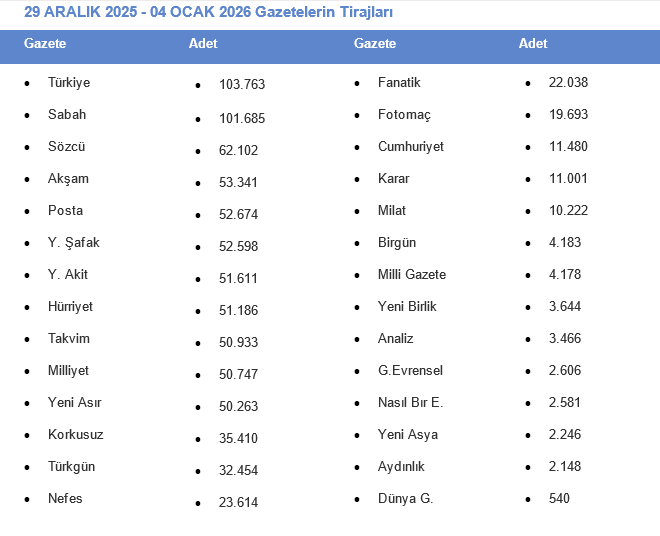 📰 GAZETELERİN HAFTALIK TİRAJLARI