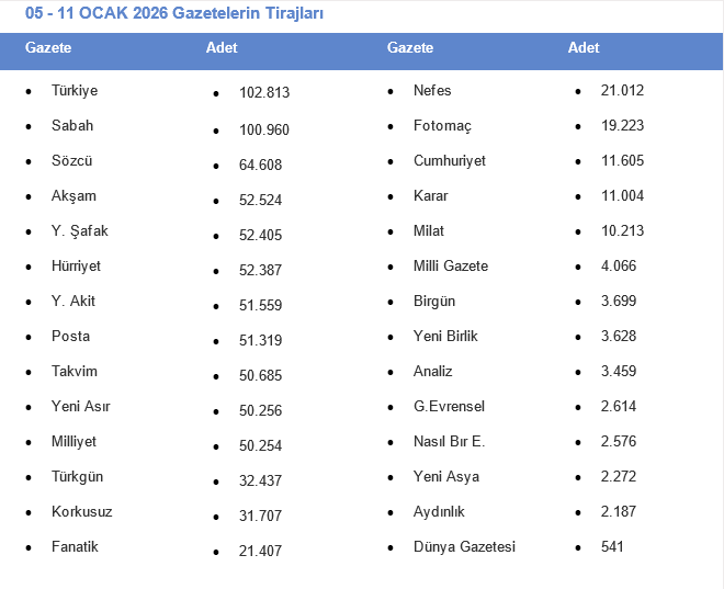 📰 GAZETELERİN HAFTALIK TİRAJLARI