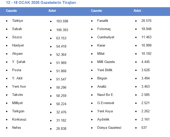 📰 GAZETELERİN HAFTALIK TİRAJLARI