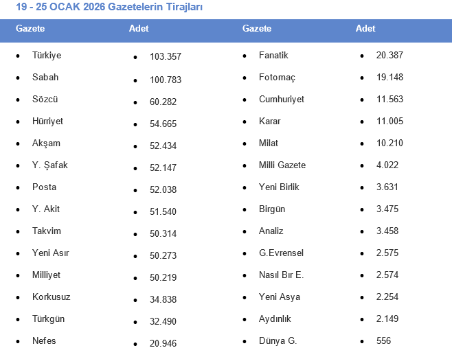 📰 GAZETELERİN HAFTALIK TİRAJLARI