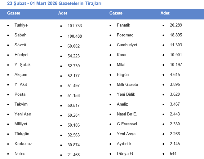 📰 GAZETELERİN HAFTALIK TİRAJLARI